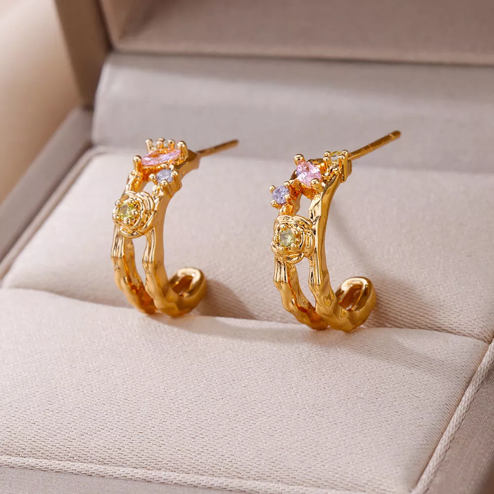 Colorful Zircon Gold Plated Stainless Steel Flower Stud Earrings