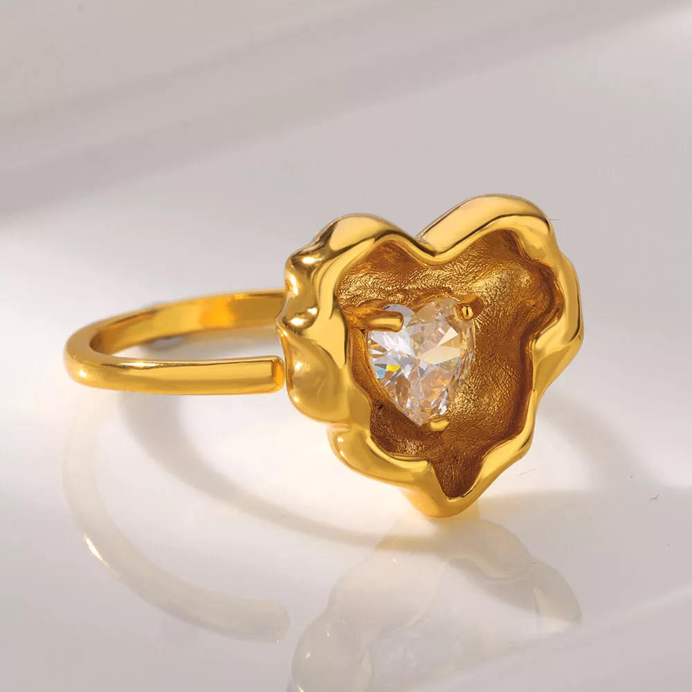 Gold Inlay Zircon Heart Ring – Adjustable Stainless Steel Romantic Band