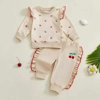 Toddler Girl Cherry Print Ruffle Sweatshirt and Pants Set