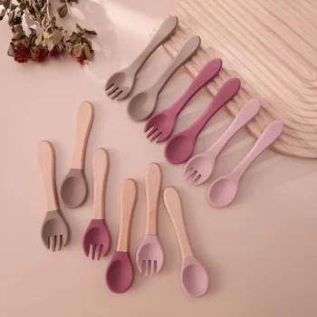 4PCS Silicone Baby Spoon and Fork Set with Wooden Handles BPA-Free