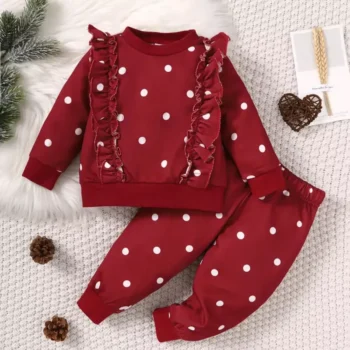 Baby Girl Autumn Hoodie & Ruffle Pants Set – Wine Red Polka Dot