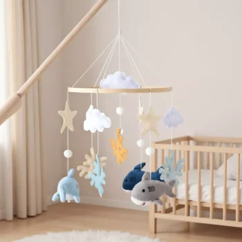 Wooden Baby Crib Mobile with Soft Felt Shark, Clouds & Bells