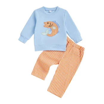 Autumn Boys 2-Piece Outfit Long Sleeve Fish Sweatshirt with Plaid Pants