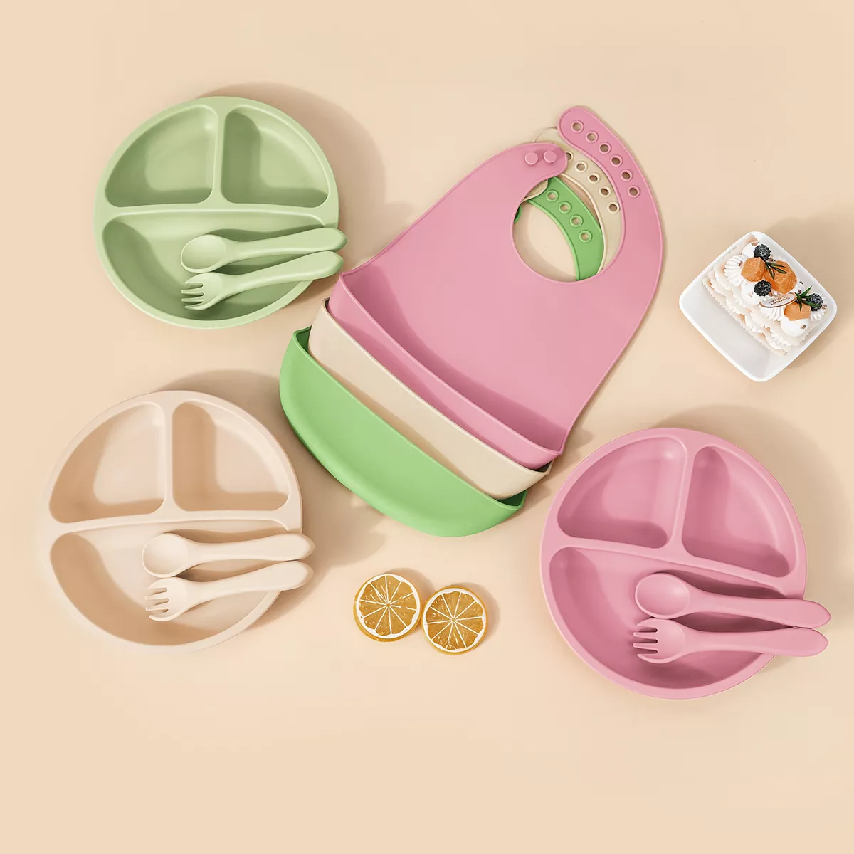 4PCS Silicone Baby Feeding Set with Dinner Plate, Spoon, Fork & Adjustable Bib