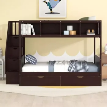 Wooden Twin Over Full Bunk Bed with Storage Staircase, Shelves, and Drawers