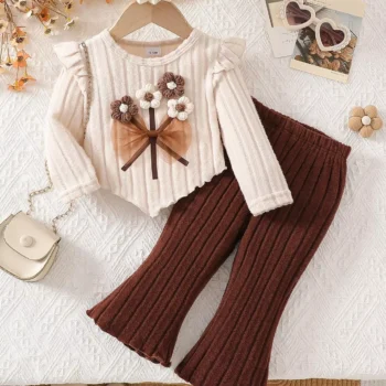 Baby Girl Autumn Floral Bow Top and Brown Bell Bottom Pants Outfit Set