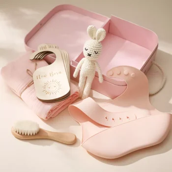Baby Bath Gift Set – 100% Cotton Towel, Silicone Bib, Bath Brush & Bunny Puppet
