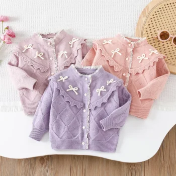 Autumn Winter Baby Girls Knit Cardigan with Lace and Bow