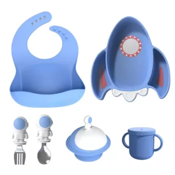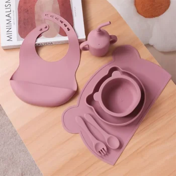 Silicone Baby Feeding Set: Bib, Divided Plate, Bowl, Cup, Spoon & Fork