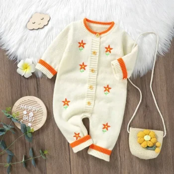 Newborn Knit Baby Girl Romper with Floral Embroidery – Long Sleeve Jumpsuit