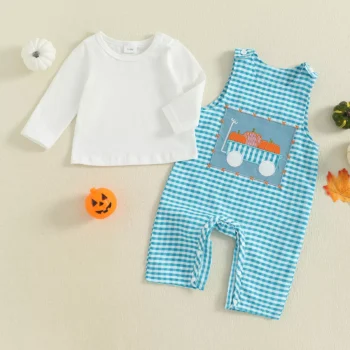 Baby Boys Halloween Outfit 2-Piece Long Sleeve Top & Plaid Overalls Set