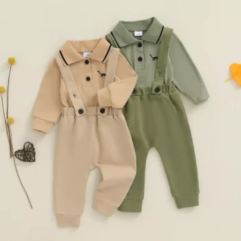 Autumn Baby Boy Dinosaur Embroidered Romper & Suspender Pants Set