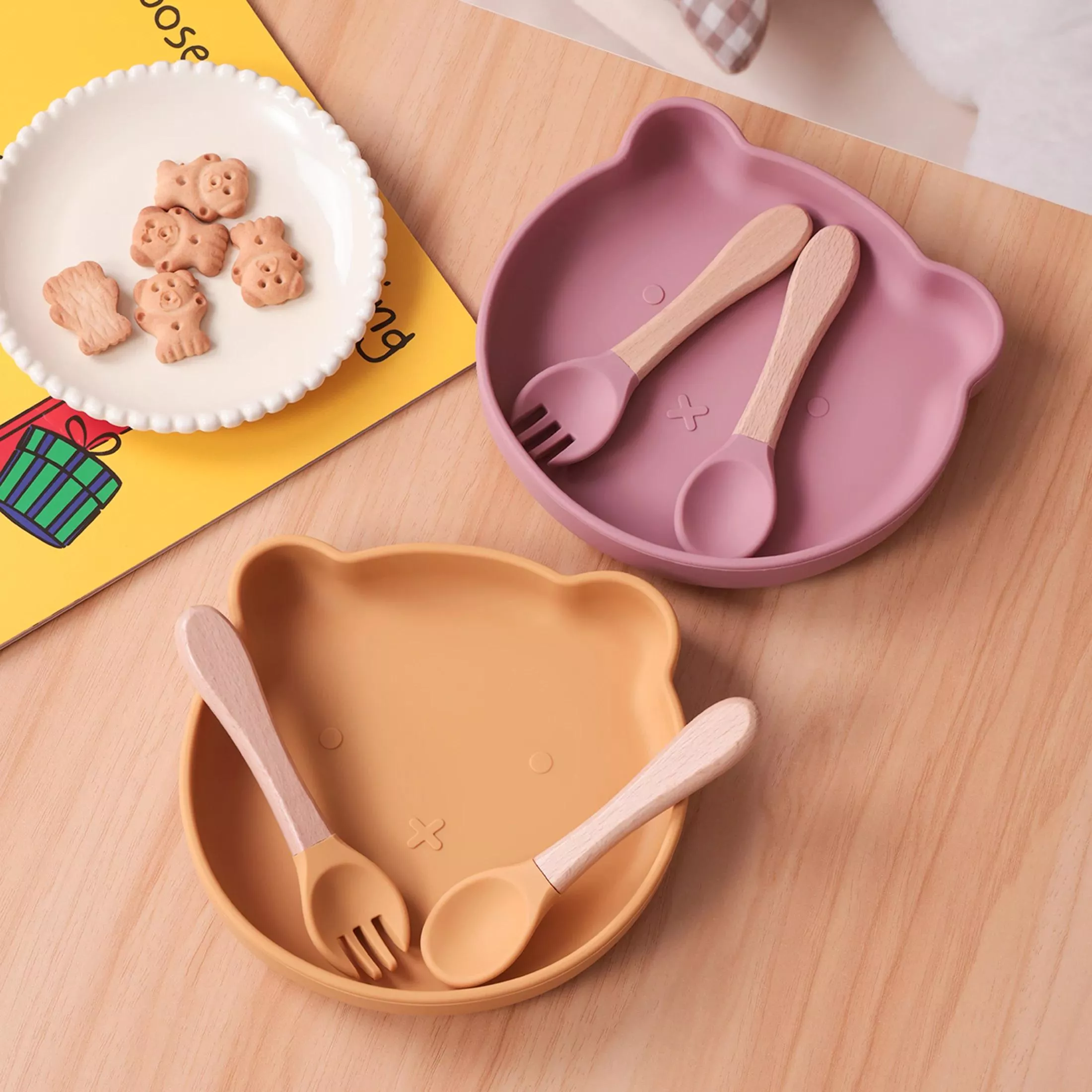Baby Silicone Feeding Set with Wooden Handle Spoon, Fork & Suction Bowl