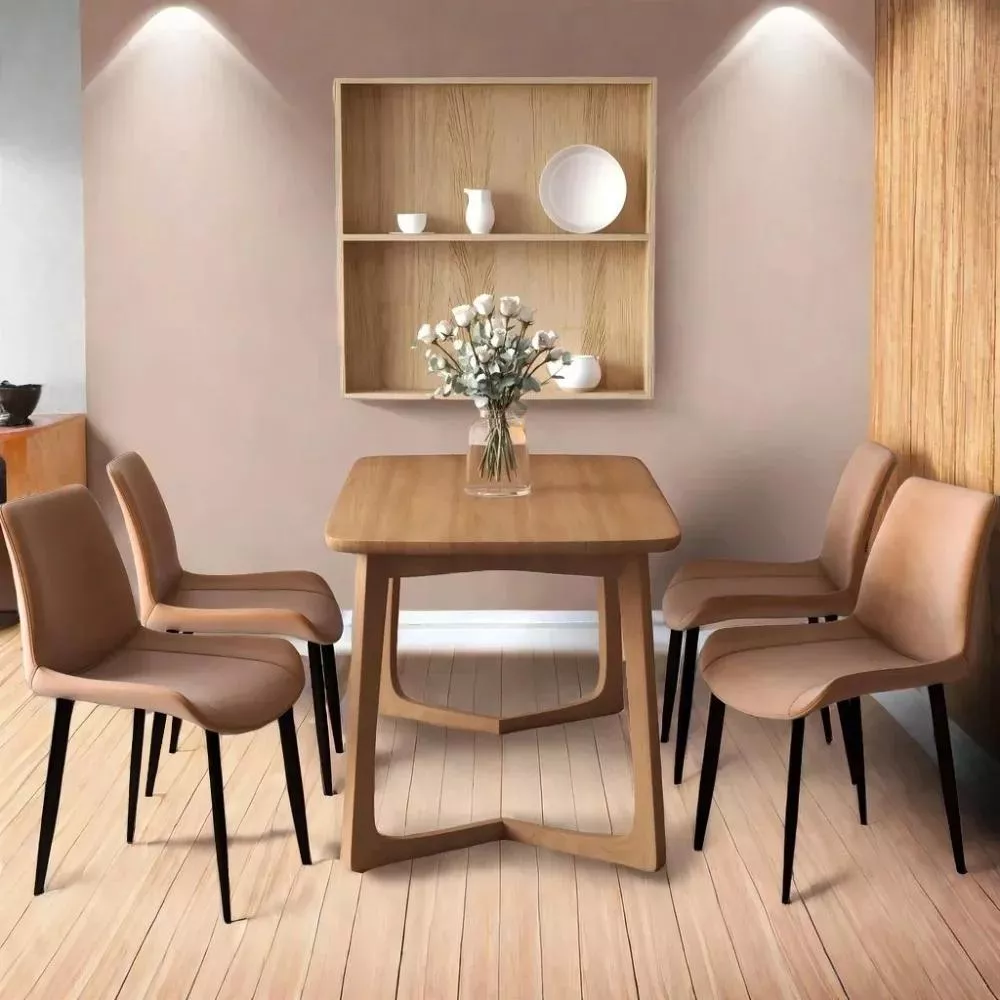 Set of 4 Modern Brown Faux Leather Dining Chairs with Wooden Armrests