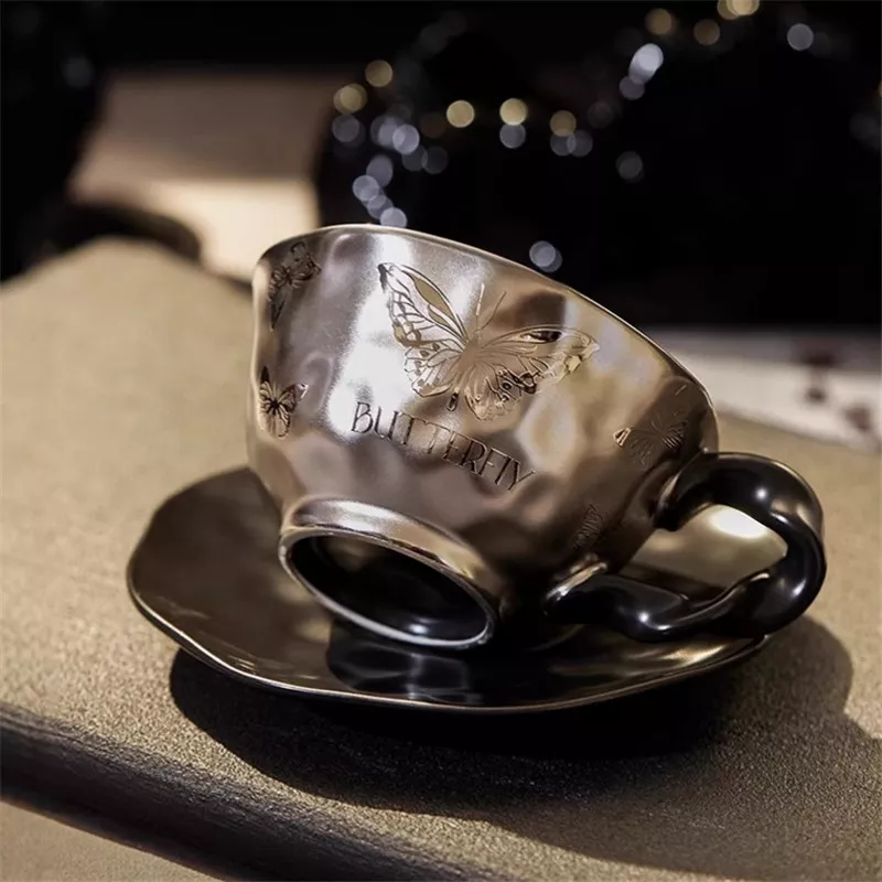 240ml Silver Ceramic Butterfly Pattern Coffee Mug & Saucer Set – Elegant Tea Cup for Home & Office