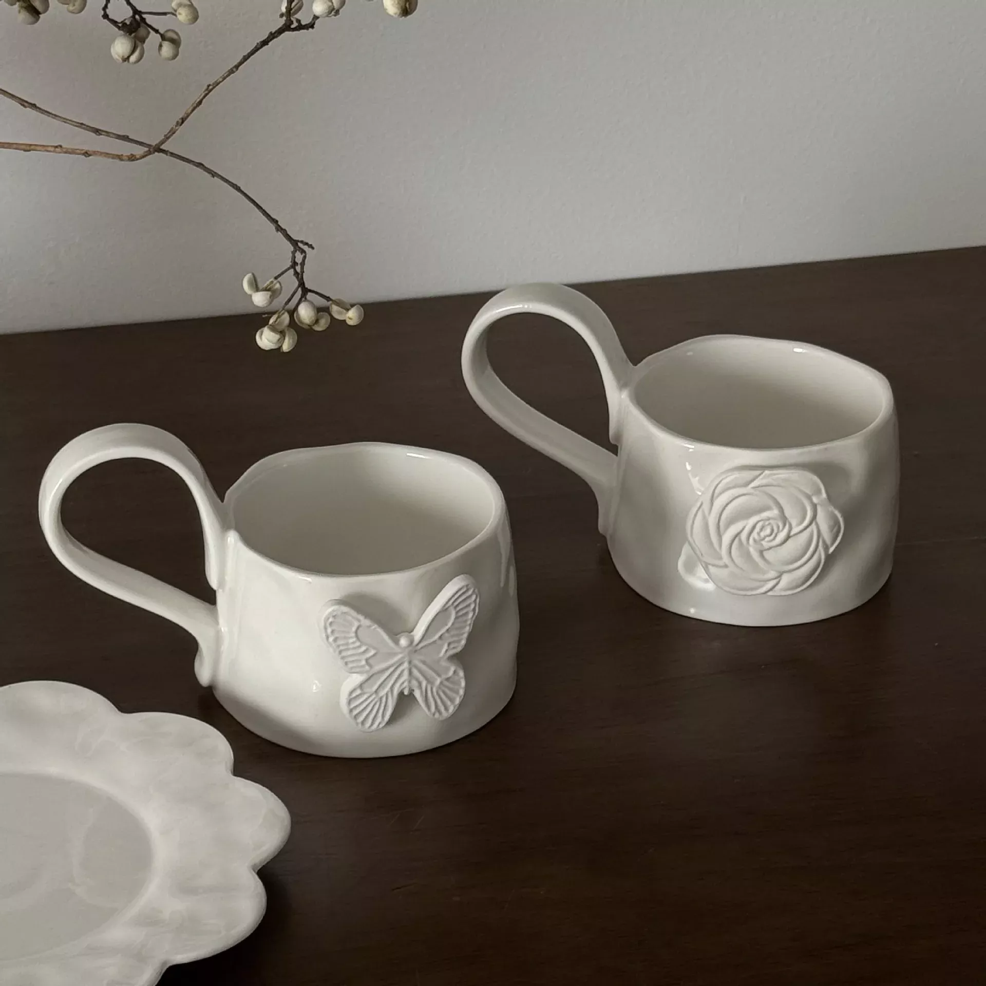 Vintage Glaze Relief Flower Ceramic Coffee Cup Set – Handmade Tea & Latte Mug