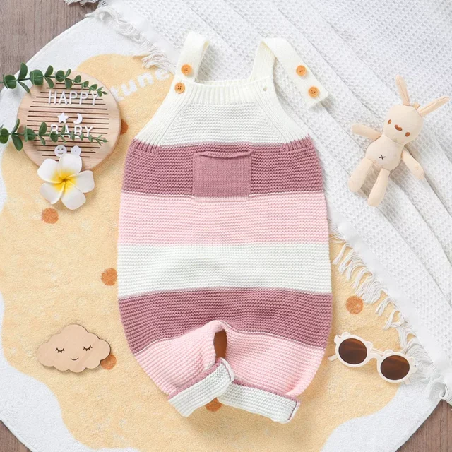 This sleeveless knitted romper features a soft, breathable acrylic blend, making it ideal for all seasons. The playful pink striped pattern and square collar add a sweet touch of vintage charm, while the pullover style ensures fuss-free dressing. Whether layered over a long-sleeve top in winter or worn alone in summer, it keeps your baby comfy and picture-perfect all day long.