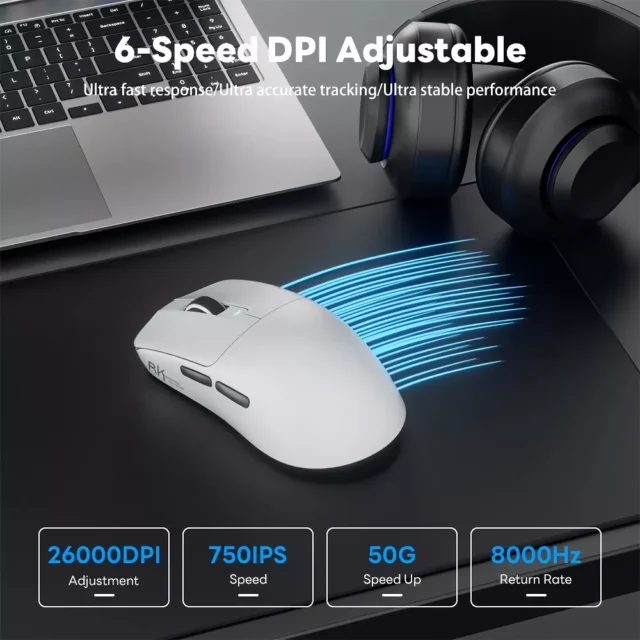 Take your gameplay to the next level with this ultra-lightweight 47g gaming mouse built for competitive performance. Designed with a high-precision optical sensor that reaches up to 26,000 DPI and a blistering 8,000Hz polling rate, every move you make is tracked with lightning-fast accuracy. Whether you’re in the middle of an intense battle or working on detailed tasks, this mouse gives you the control you need without slowing you down.