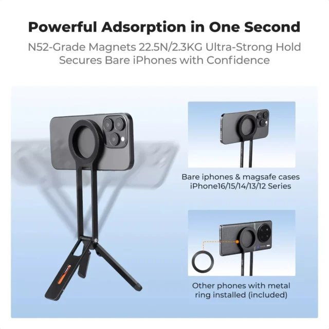 The dual-sided magnetic design works seamlessly with recent iPhone models (16/15/14/13/12 series), compatible magnetic cases, and phones with an added metal ring (included). The front side offers a powerful hold for your phone, while the back features a weaker magnet designed to attach accessories like lights or filters—ideal for enhancing your creative setup.