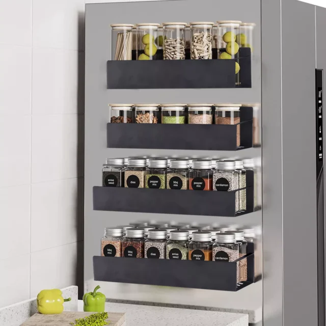 Each spice rack is crafted from durable metal, providing a robust and reliable space to hold your cooking essentials. With a waterproof and rustproof finish, these magnetic racks are built for long-term use. The strong magnets ensure a stable connection to your refrigerator, while the elegant design adds a modern touch to your kitchen décor. The spacious design makes it easy to store multiple items without taking up valuable counter space.