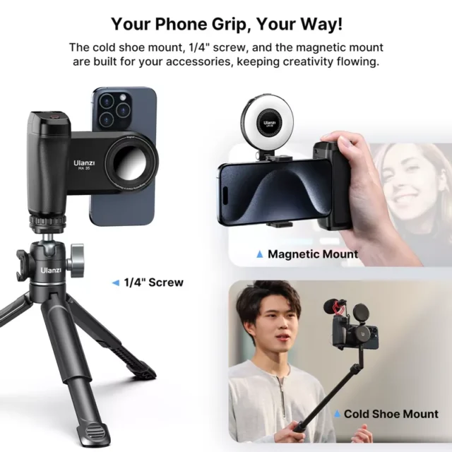 Whether you’re filming travel vlogs, capturing family events, or shooting social media content, this smartphone grip is your go-to accessory. It bridges the gap between casual smartphone photography and professional-level results. With its stable design, wireless shutter, and multiple mounting options, it’s ideal for creators, adventurers, and anyone who wants to make every photo and video count.