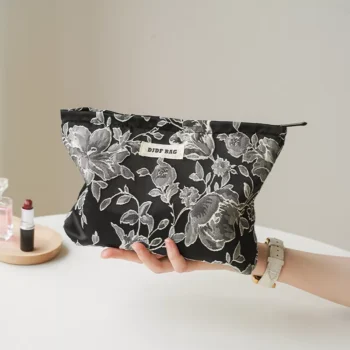 Large Capacity Black Floral Cosmetic Bag – Travel Makeup Organizer