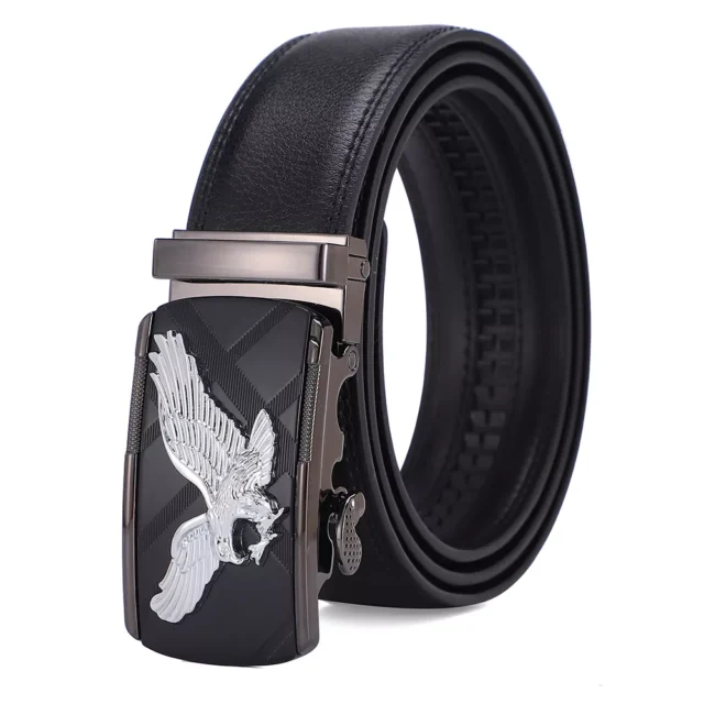 Command attention with every step you take. This men’s leather belt combines timeless elegance with rugged masculinity through its bold automatic eagle buckle and premium genuine leather strap. Designed to make a strong statement, this high-quality belt is the perfect blend of style, strength, and function—ideal for both business attire and upscale casual wear.