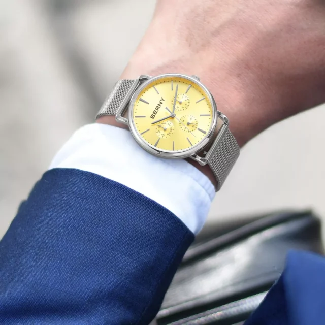 This wristwatch is not just about telling time—it’s about making a statement. Its ergonomic design fits your wrist perfectly, while the quick-release mesh strap allows you to adjust or swap bands effortlessly. The elegant detailing and modern dial design make it versatile enough for both business and casual wear. Lightweight yet durable, slim yet strong, it’s a timepiece built for men who value style, comfort, and precision in every detail.