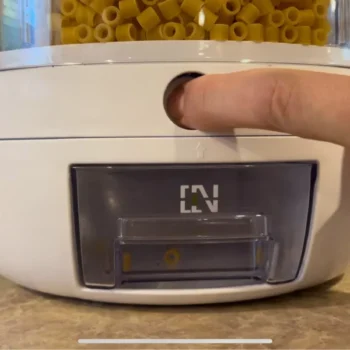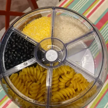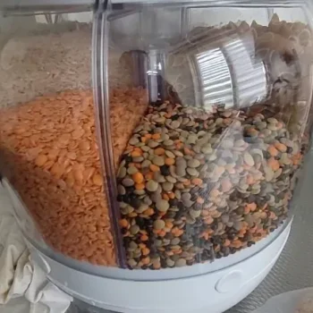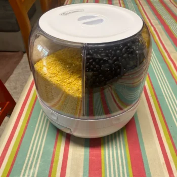 Excellent for lentils and rice but struggles with larger beans. A handle for easier rotation would enhance the experience. Still, a great addition for efficient storage.