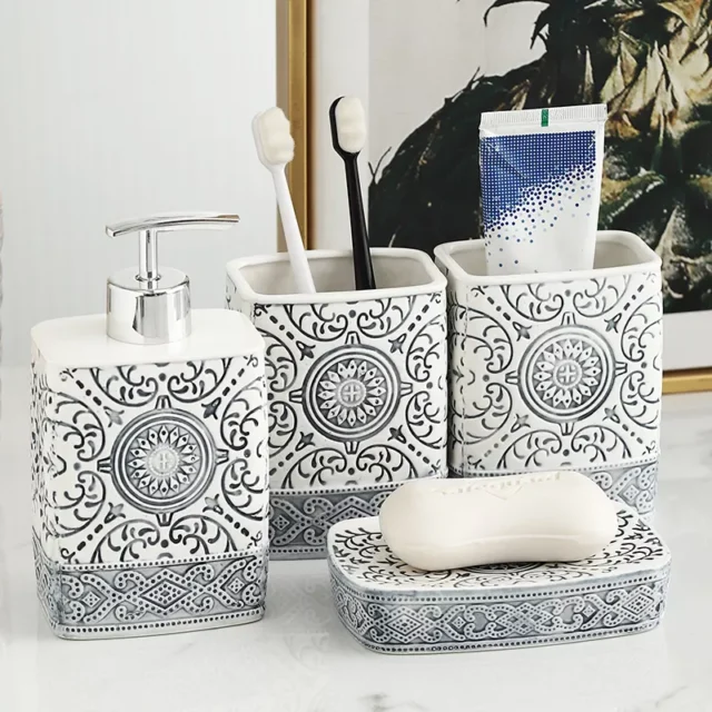 Transform your bathroom into a serene, spa-like retreat with this modern ceramic bathroom accessory set. Crafted from high-quality porcelain, each piece features a delicate floral texture that adds a touch of timeless elegance to your space. The clean white finish and smooth curves make it a perfect match for any bathroom décor, from classic to contemporary.
