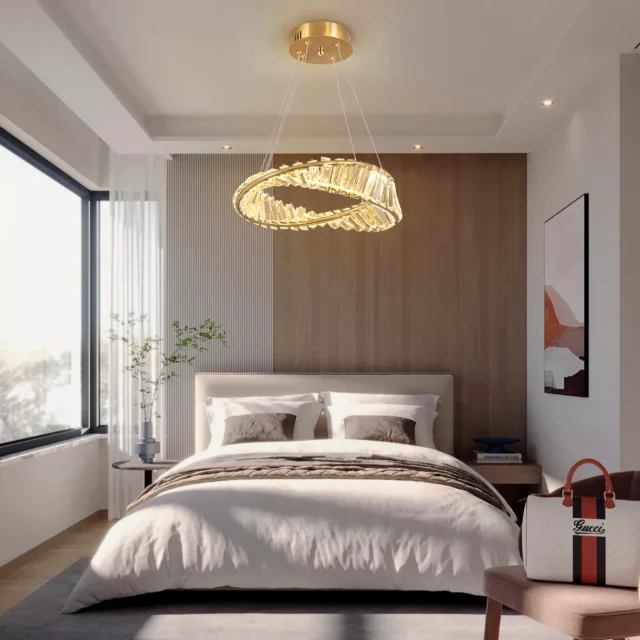 Make a bold statement with this exquisite gold crystal pendant light. Its eye-catching Möbius strip shape and versatile lighting options create an inviting atmosphere for your living or dining space. Upgrade your home décor effortlessly—choose this luxurious chandelier to brighten your room with style and elegance.
