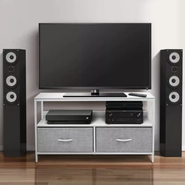Our TV stand is more than just a piece of furniture; it’s a versatile solution for your storage and entertainment needs. Whether you’re displaying your favorite TV or organizing your wardrobe, this stand seamlessly adapts to your requirements. The fabric bins are perfect for concealing clutter while adding a touch of elegance to your space. The deep drawers and additional middle shelf offer ample storage, while the sleek white frame with gray drawers enhances its overall aesthetic appeal.