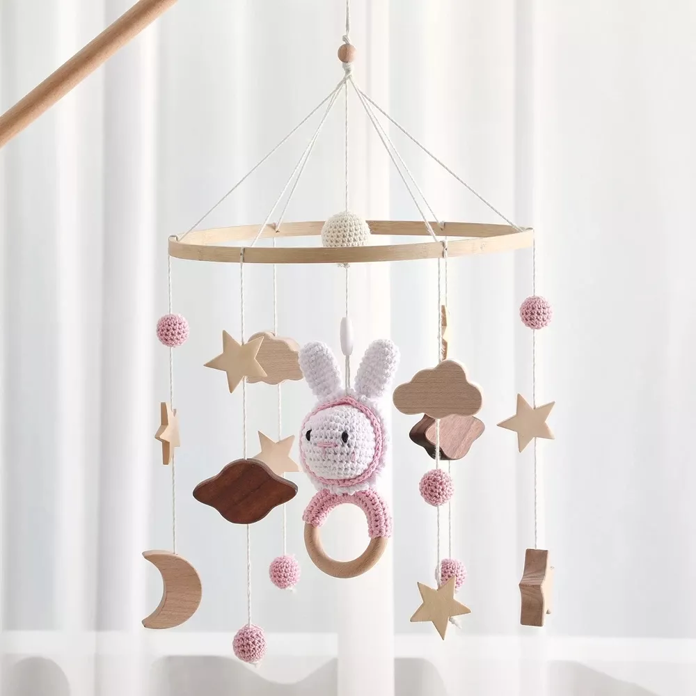 Pink Bunny Crochet Baby Crib Mobile with Wooden Rattle and Music Box