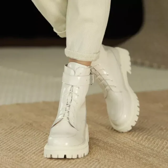 Crafted with a high-shine patent leather exterior and a plush wool lining, these boots provide both durability and a luxurious feel. The chunky heel and platform sole not only elevate your look—literally—but also offer added support and traction, ideal for slippery sidewalks or uneven terrain.