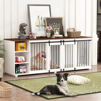 Large Wooden Dog Crate Furniture, 86.6″ Kennel with Shelves, Divider & Sliding Door