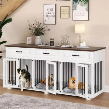71″ Wooden Dog Crate with Drawers and 3 Rooms – Stylish Dog House Furniture