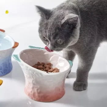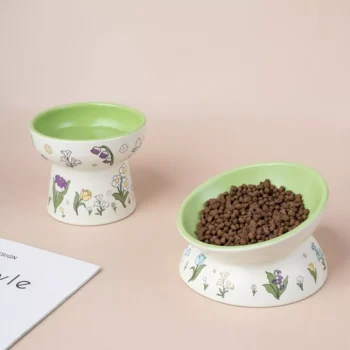 Green Ceramic Cat Bowl with Non-Slip Base & Floral Design