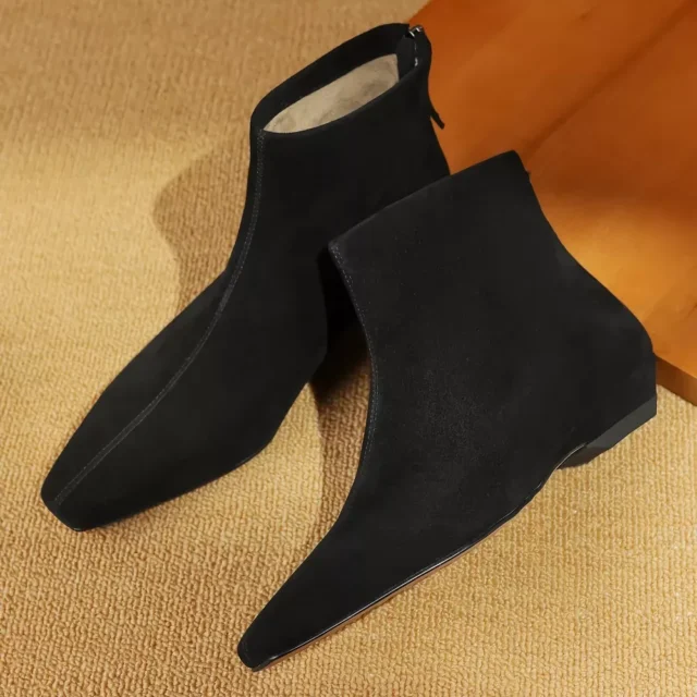These ankle boots are more than just footwear; they’re a statement. The soft suede leather gives them a polished yet casual look that can be paired effortlessly with jeans, leggings, or dresses. The low, flat heel ensures comfort, making them perfect for long days on your feet without sacrificing style. Plus, the square toe provides a roomy fit, giving your feet the space they deserve. With the easy-to-use back zipper, slipping these boots on and off is a breeze.