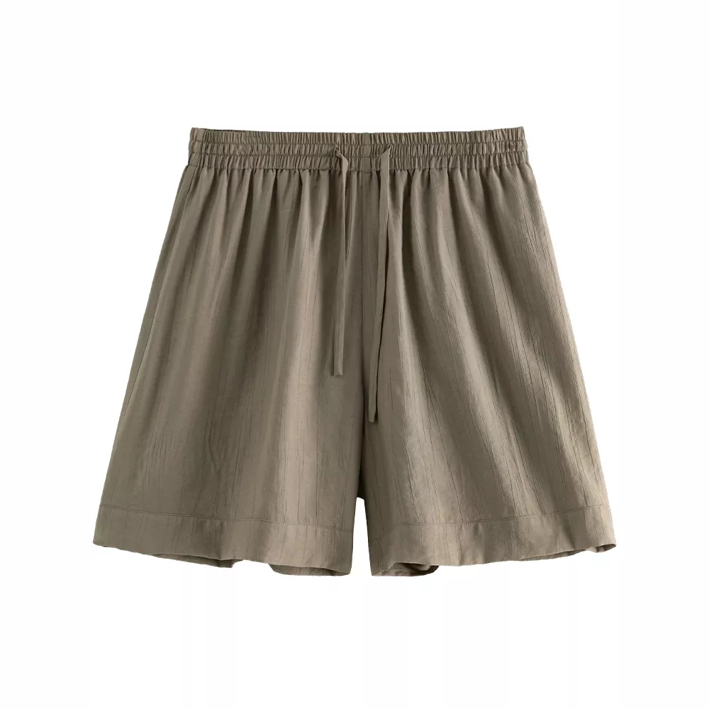 The full-length blouse pairs seamlessly with the matching shorts, which come with a convenient drawstring closure for an adjustable fit. Both pieces include practical pockets, offering space to carry your essentials while you’re on the go. The khaki green color is a versatile choice, complementing various skin tones and allowing easy pairing with your favorite accessories.