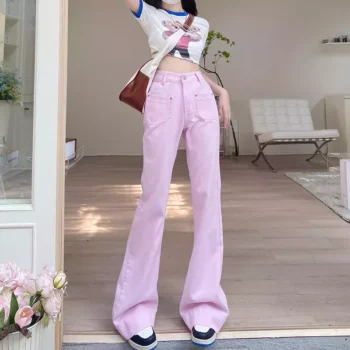 Chic Pink Flare Denim Jeans – Vintage Baggy Y2K Aesthetic – Full Length Women’s Trousers