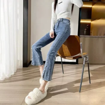 High Waist Pearl Jeans – Women’s Flare Denim with Chic Slits