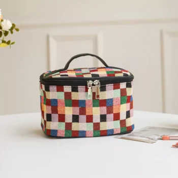 Large Plaid Cosmetic Bag for Women – Double Zipper Travel Toiletry Organizer