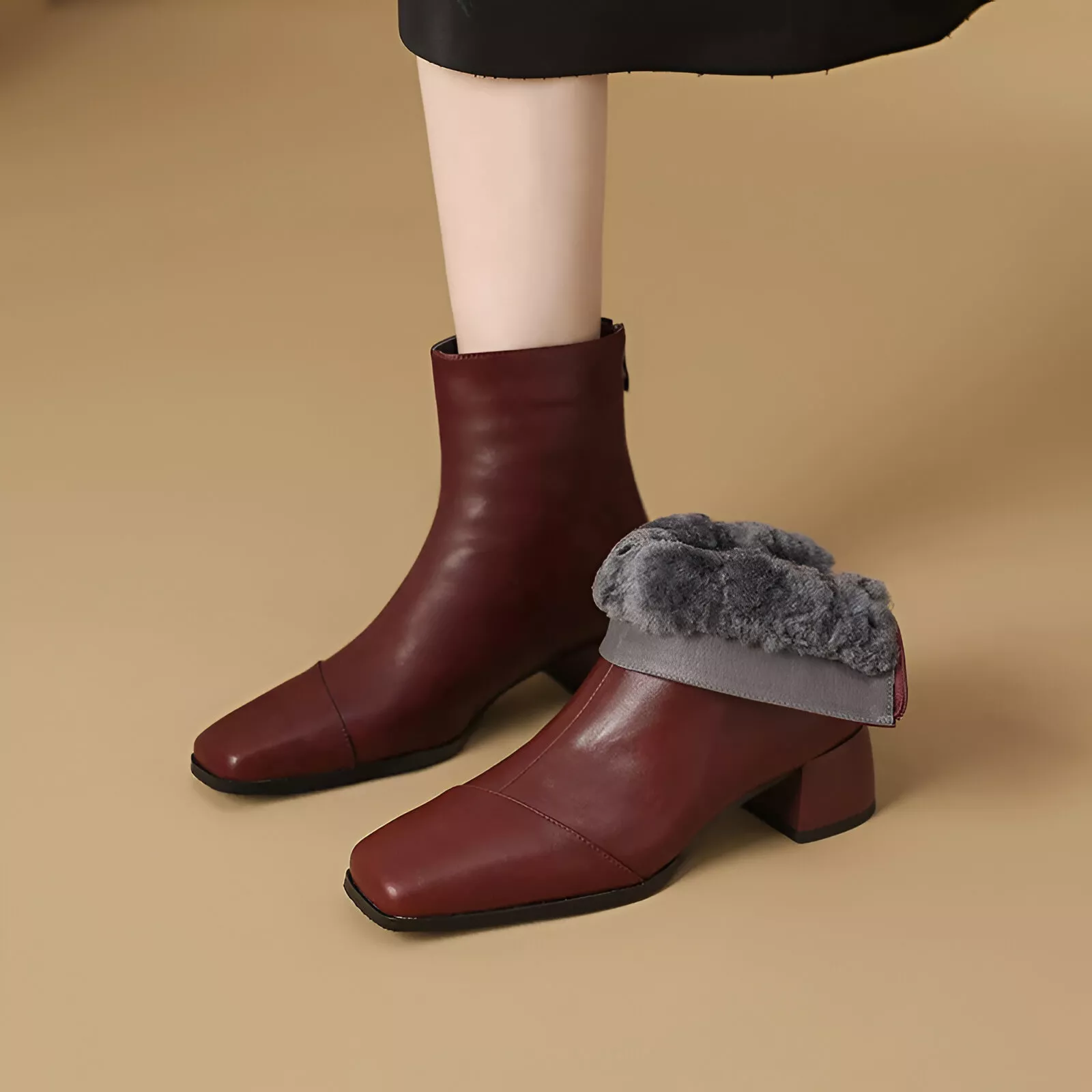 Winter Square Toe Chunky Heel Leather Boots with Warm Wool Lining