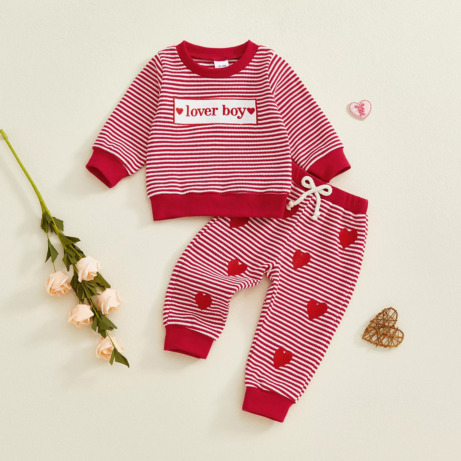 Toddler Boy Valentine Outfit Striped Long Sleeve Top & Heart Pants Set