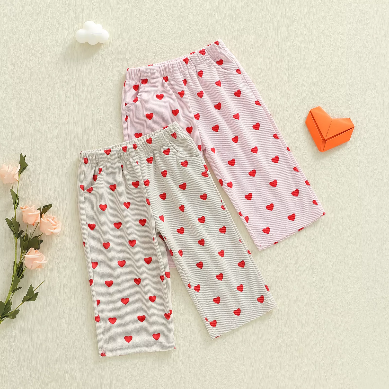 Girls Valentine Heart Corduroy Wide Leg Pants with Elastic Waist