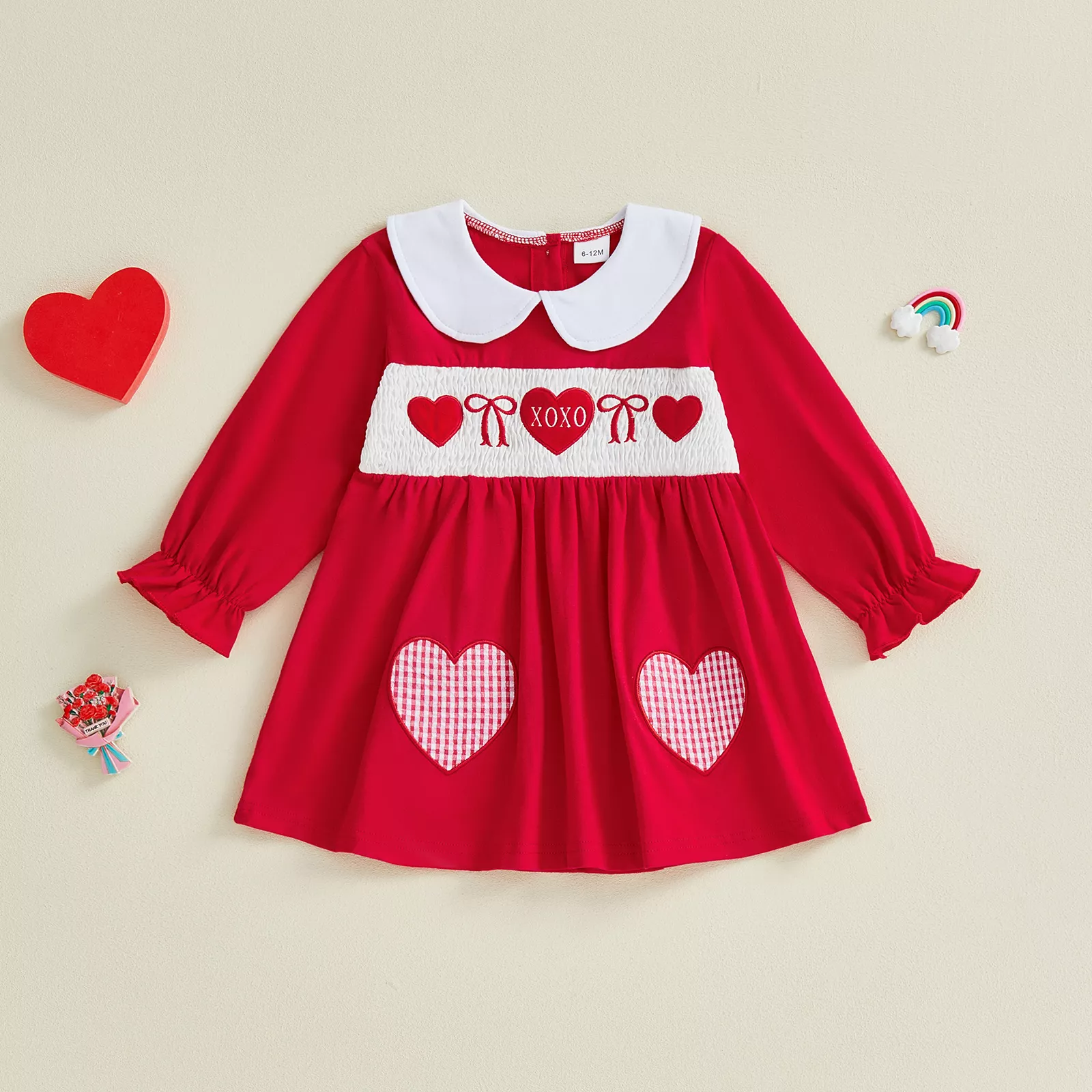 Valentine’s Toddler Girl Heart Embroidery A-Line Dress with Bow Collar