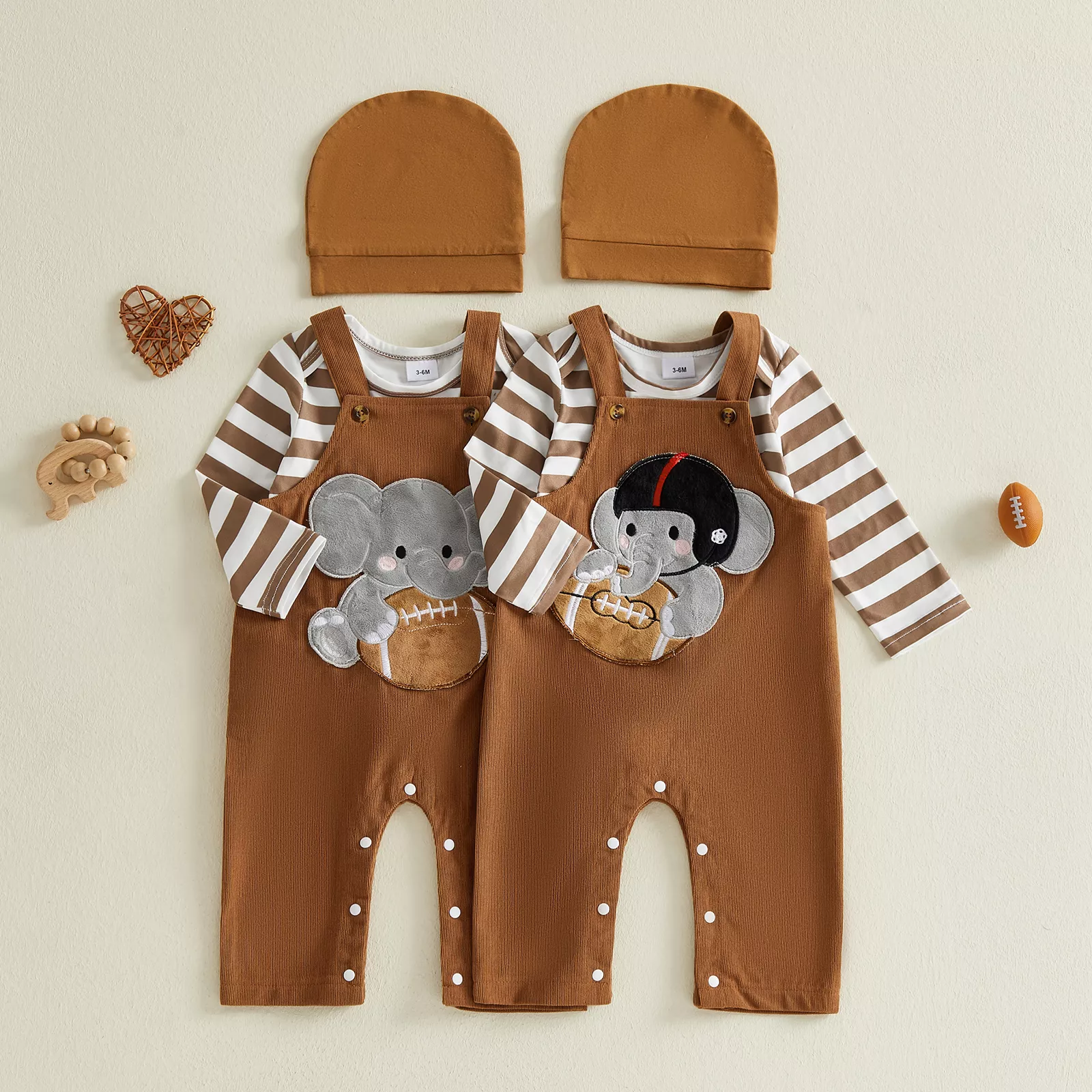 Baby Boy 3-Piece Striped Romper Outfit with Elephant Overalls & Hat
