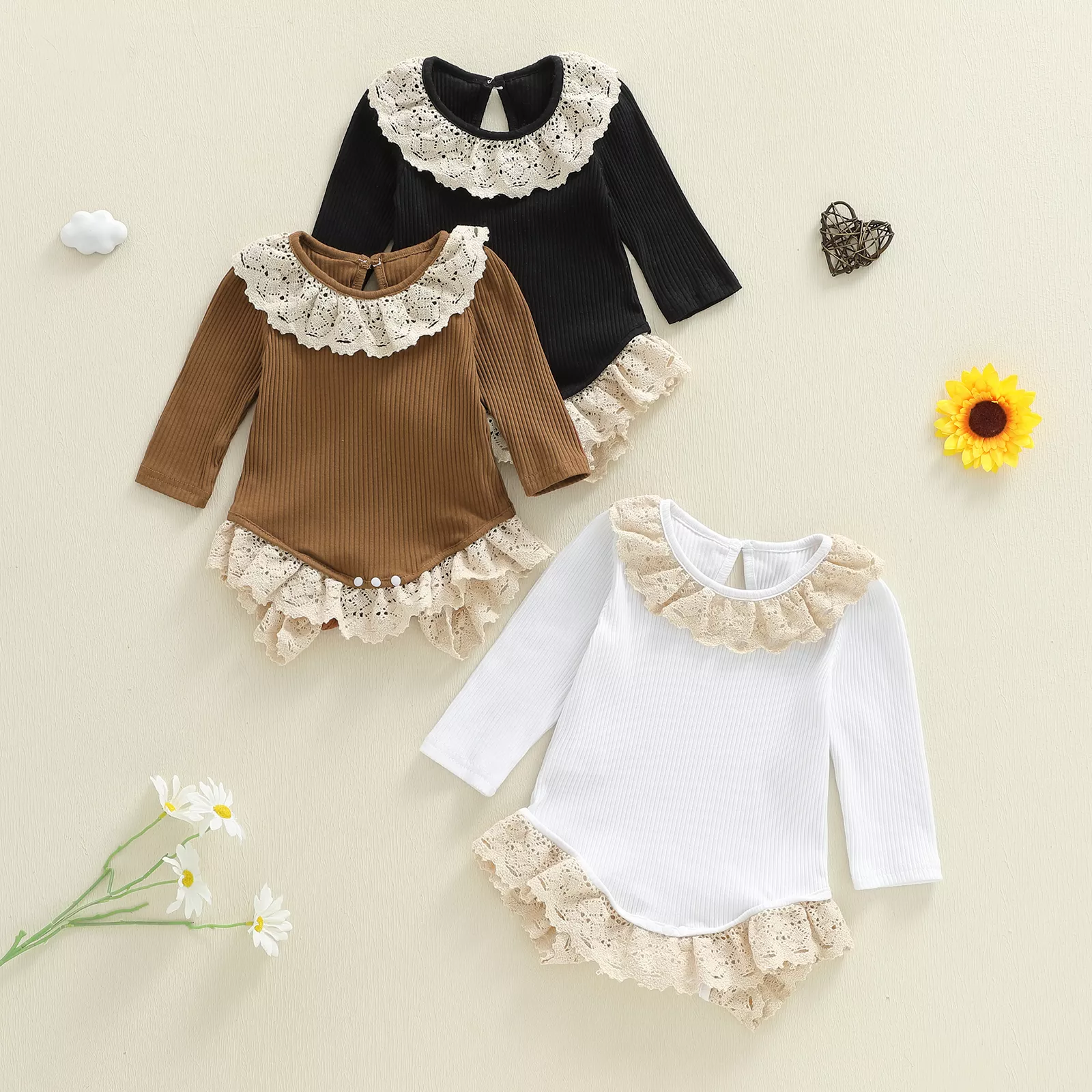Baby Girl Lace Trim Long Sleeve Romper for Newborns to 18 Months