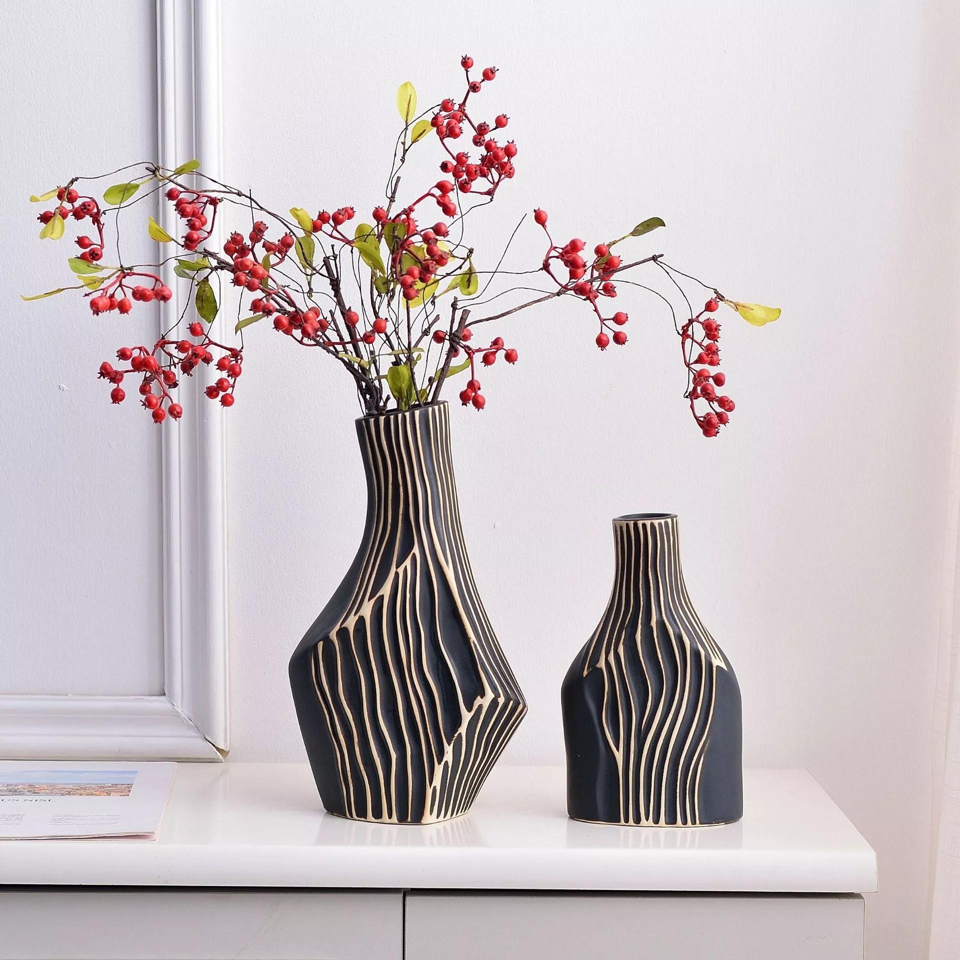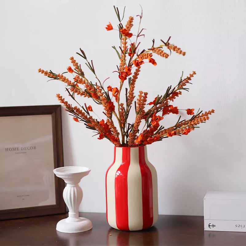 Ceramic Red Geometric Stripe Vase for Tabletop Flower Arrangements