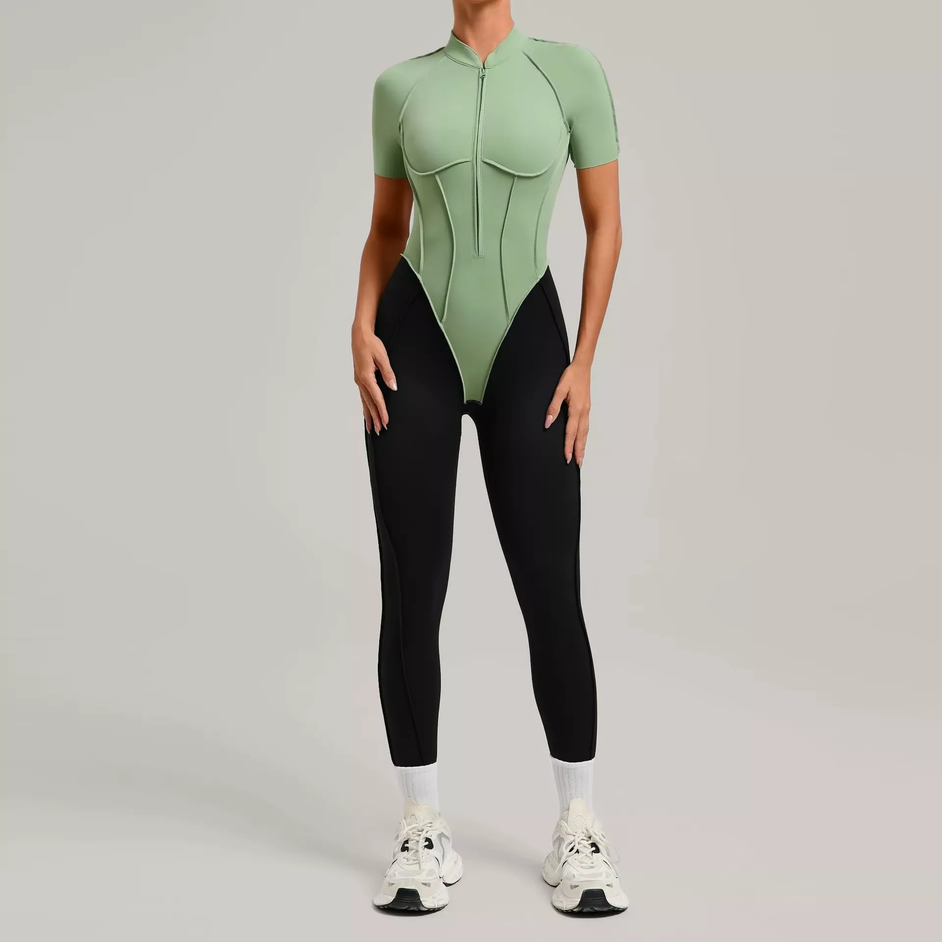 Seamless Long Sleeve Zip-Front Yoga Jumpsuit with Built-In Pad